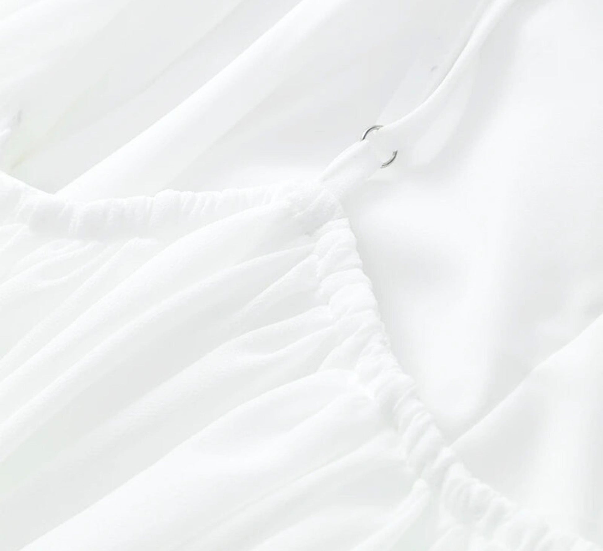 Vyrobené z bielej sieťoviny, tieto mini šaty s odhaleným chrbtom sú zosobnením ženského pôvabu. Navrhnuté pre sebavedomé ženy, tieto šaty majú lichotivý výstrih do V, jemnú sieťovinu a odvážny dizajn s odhaleným chrbtom.
